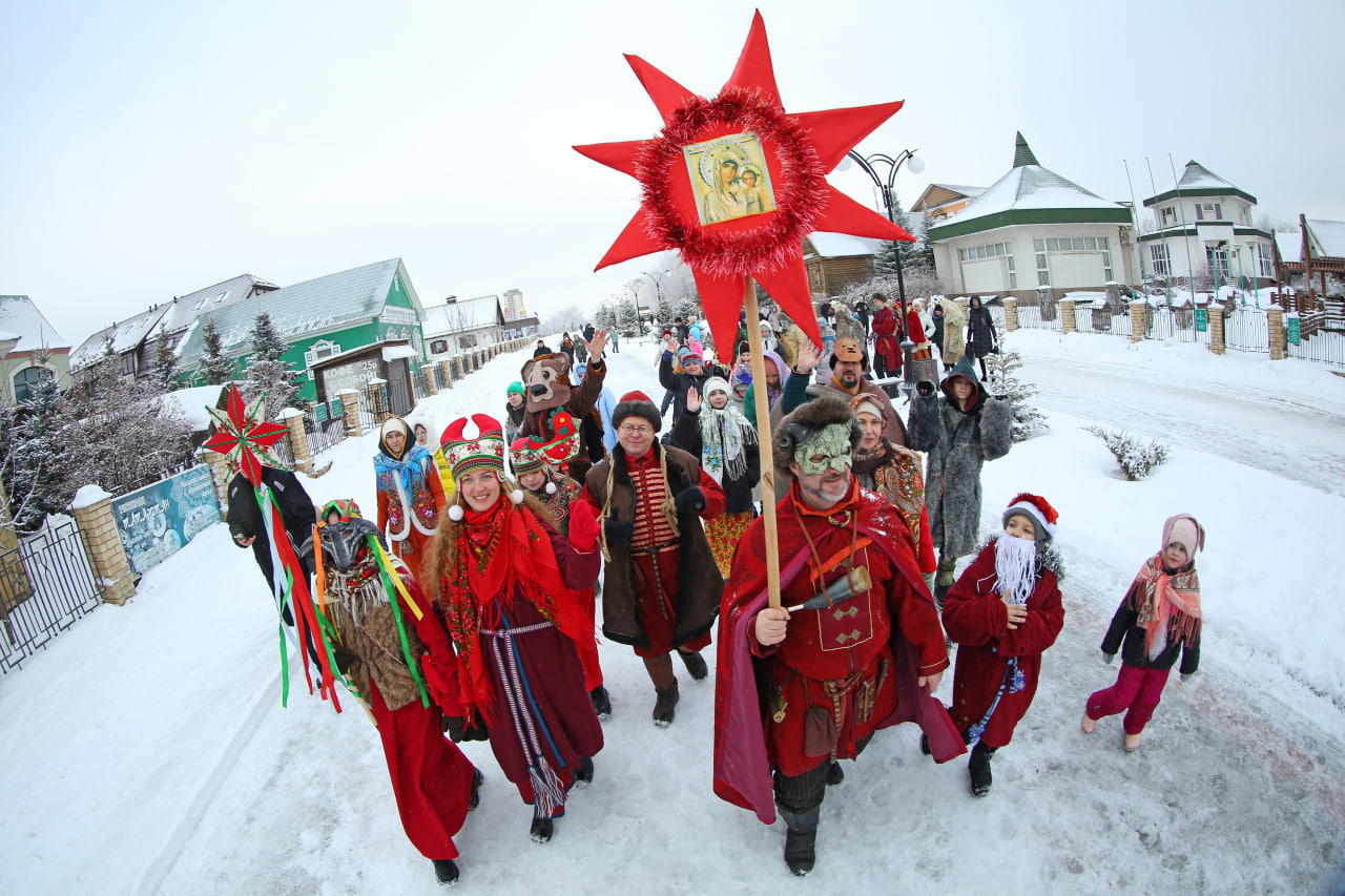 Медведи, козы и быки зазывали гостей участвовать в русских народных забавах. Взрослые и дети перетягивали канат, боролись подушками. Вместе с ряжеными гости пронесли Рождественскую заезду по национальным подворьям, спели колядки.