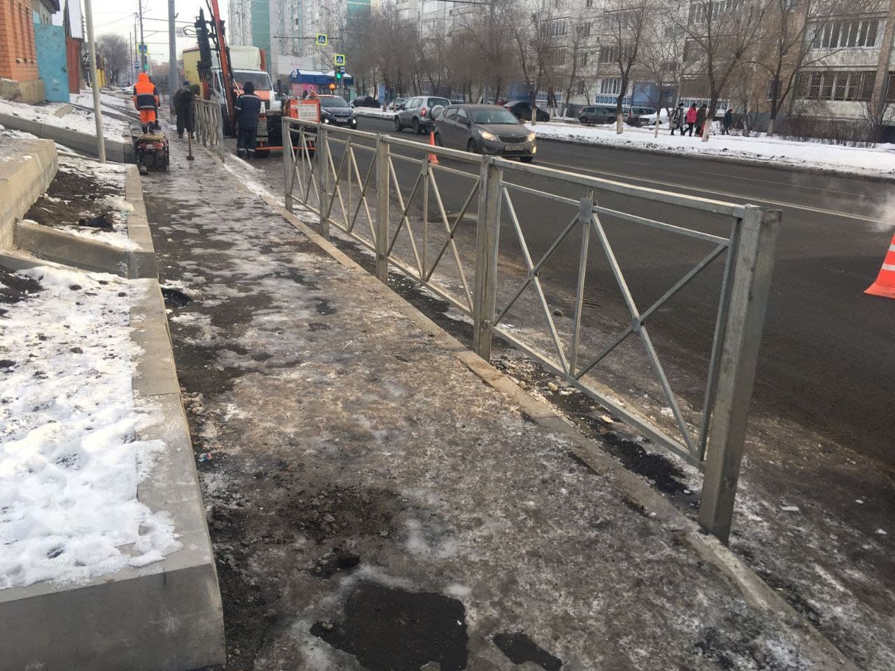 Сегодня подрядчик приступил к установке на этом участке пешеходных ограждений.