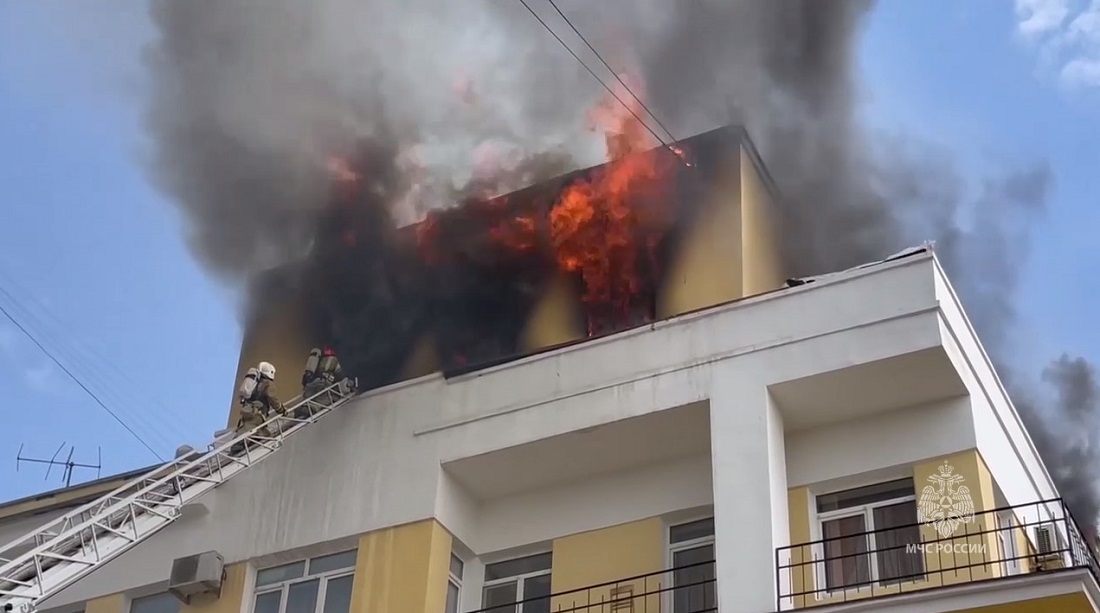 Улица Горького сейчас закрыта для движения. Сотрудники полиции оцепили территорию и не подпускают людей к месту пожара. По последней оперативной информации, 3 — 4 квадратных метра кровли сгорели полностью, на место направлены три подъемника.