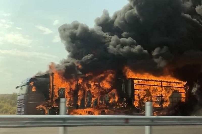 Сообщения об объятом пламенем грузовом автомобиле в социальных сетях разместили очевидцы.