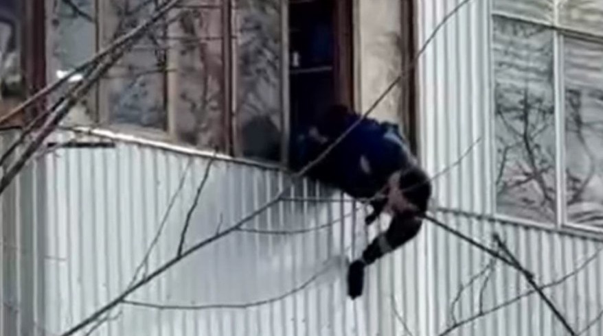 В сети появилось видео выходного дня – спасение гревшегося на солнышке кота с карниза на пятом этаже.