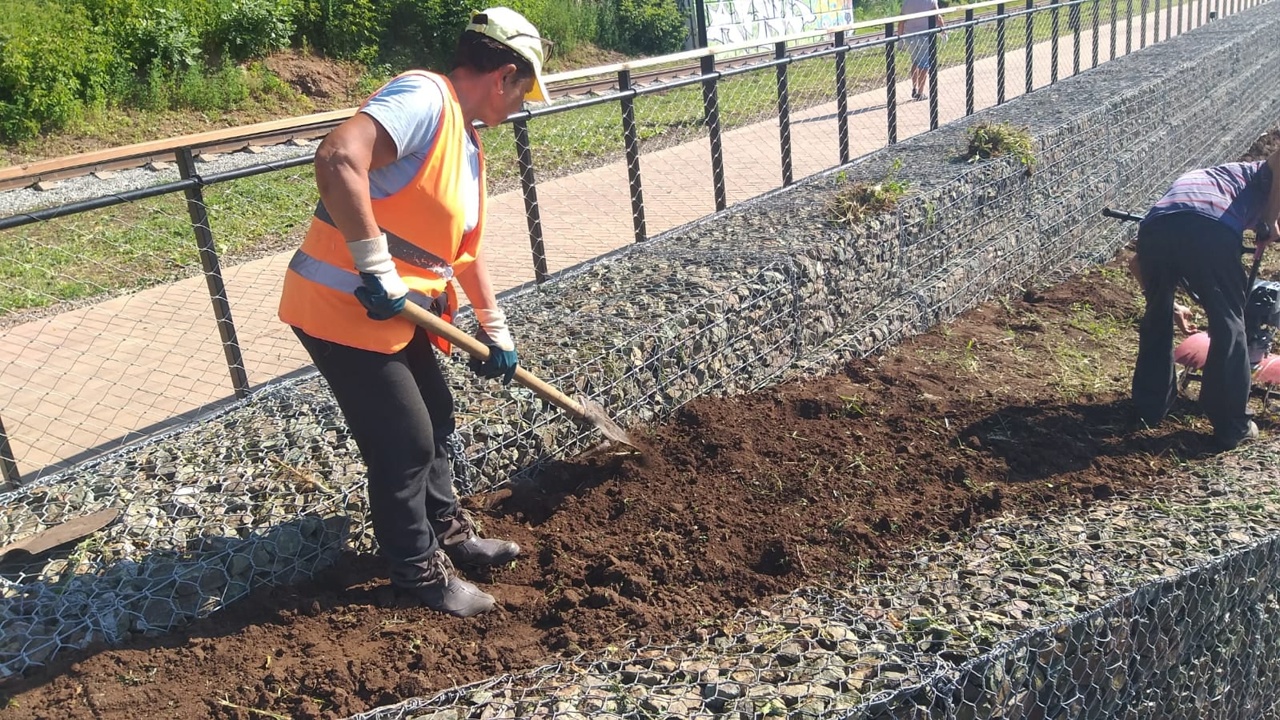 Также выполняется ремонт габионной подпорной стены, деревянного настила и других элементов благоустройства. Накануне здесь подготовили место для посадки газона: территорию очистили от сорняков, вспахали. Сегодня газон посеяли, полили и накрыли специальным материалом, который защитит семена от птиц, а также создаст благоприятный микроклимат для всходов.
