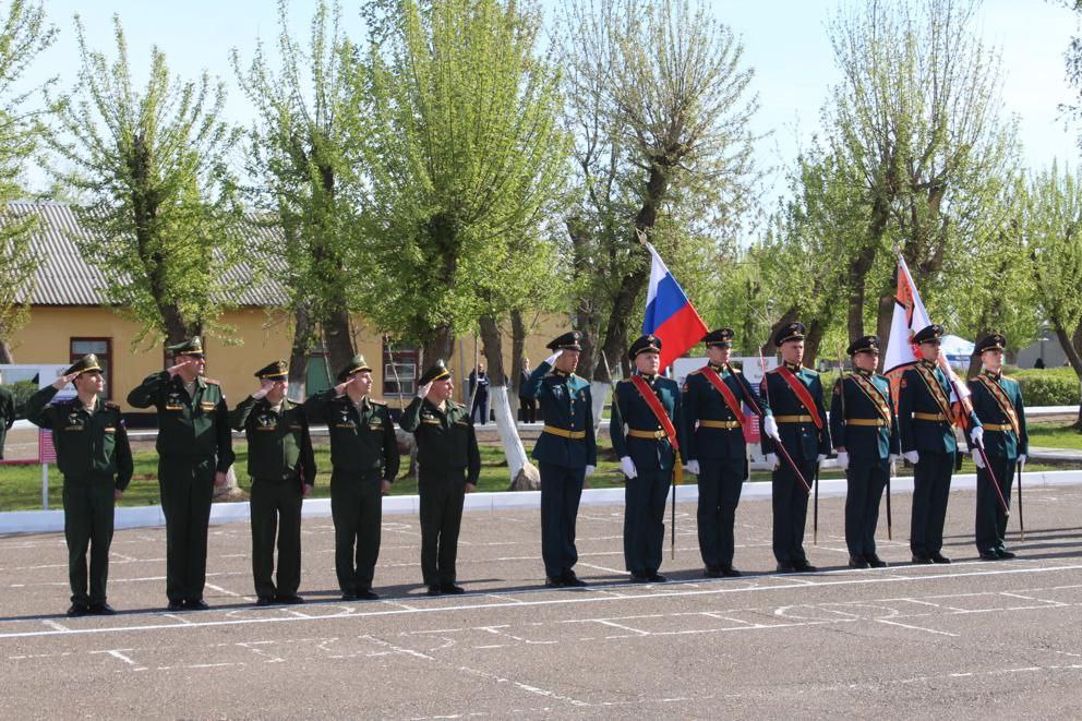 Военнослужащие и юноши призывного возраста собрались на плацу воинской части. Мероприятие началось с торжественного выноса знамен России и воинской части под звуки духового оркестра.
