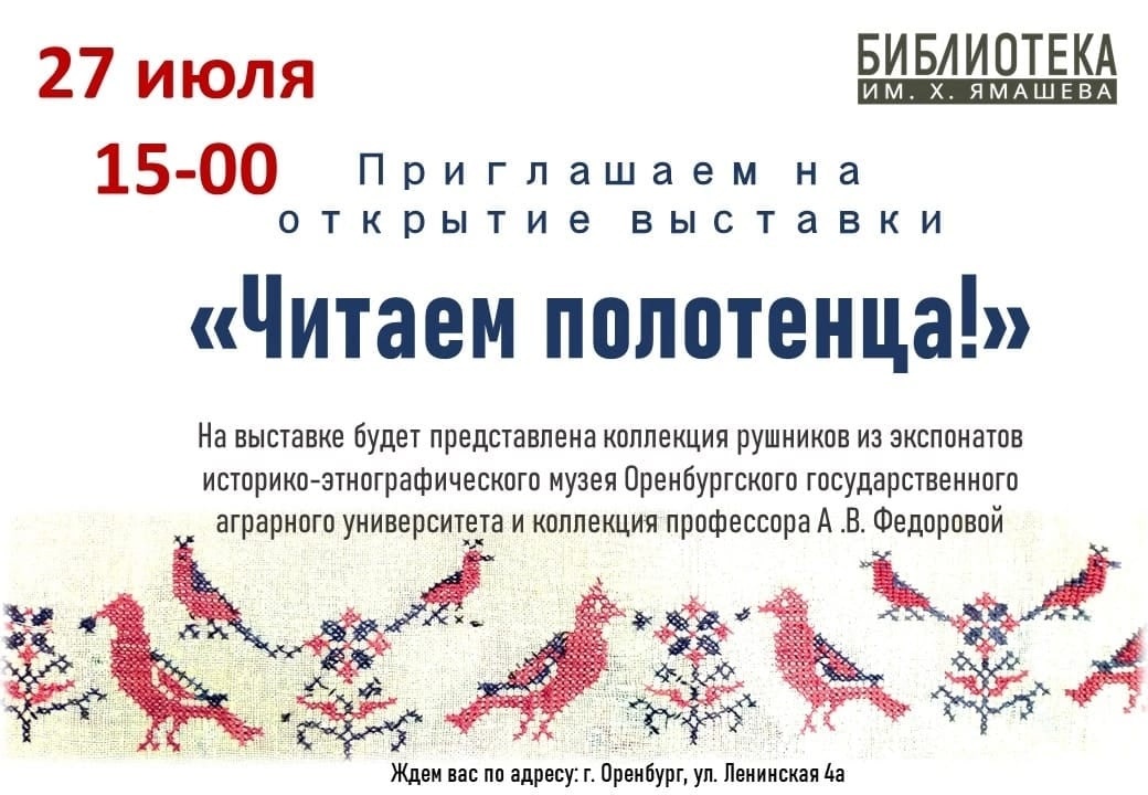 27 июля в 15.00 в библиотеке имени Ямашева (улица Ленинская, 4а) начнёт работу выставка «Читаем полотенца».