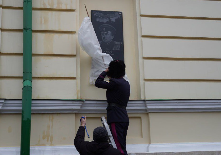 На фасаде дома №7 на проспекте Парковом установили памятный знак с именем выдающегося военного летчика, кавалера Георгиевского оружия.