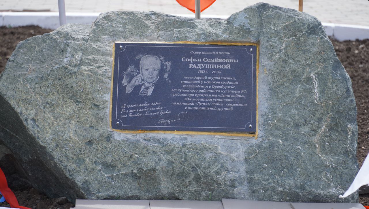 Памятный знак выдающемуся журналисту Софье Радушиной открыли 6 мая в одноимённом сквере на перекрестке улиц Туркестанской и Маршала Жукова.