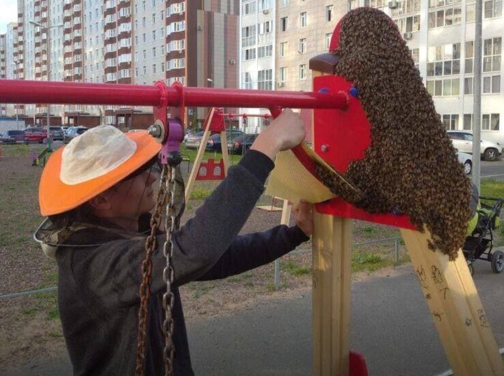 Жители микрорайона «Дубки» стали свидетелями необычного явления. Во двор многоквартирного дома прилетел рой пчел и буквально облепил одну из качелей.