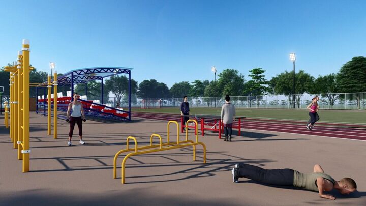 Она будет включать в себя мини-футбольное поле, трибуну, оборудованные площадки для игры в волейбол и баскетбол, воркаут-зону, беговые дорожки и несколько уличных силовых тренажеров.