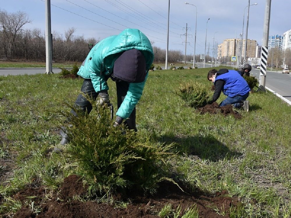 В областном центре на проезде Северном городские службы высаживают кустарники можжевельника и туи.