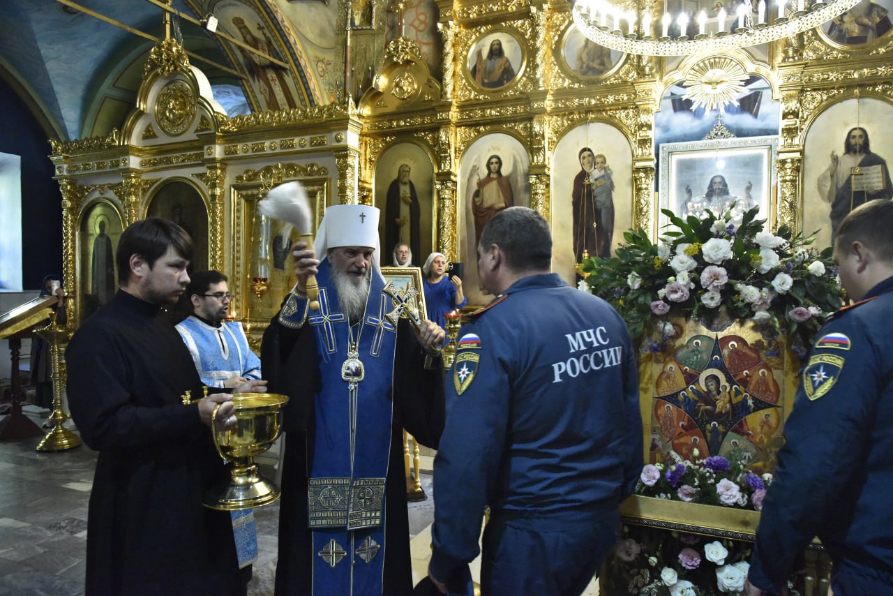 Эта святыня считается покровительницей пожарных, поэтому на службу пришли сотрудники Главного управления МЧС по Оренбургской области во главе с начальником генерал-майором Александром Зеновым.