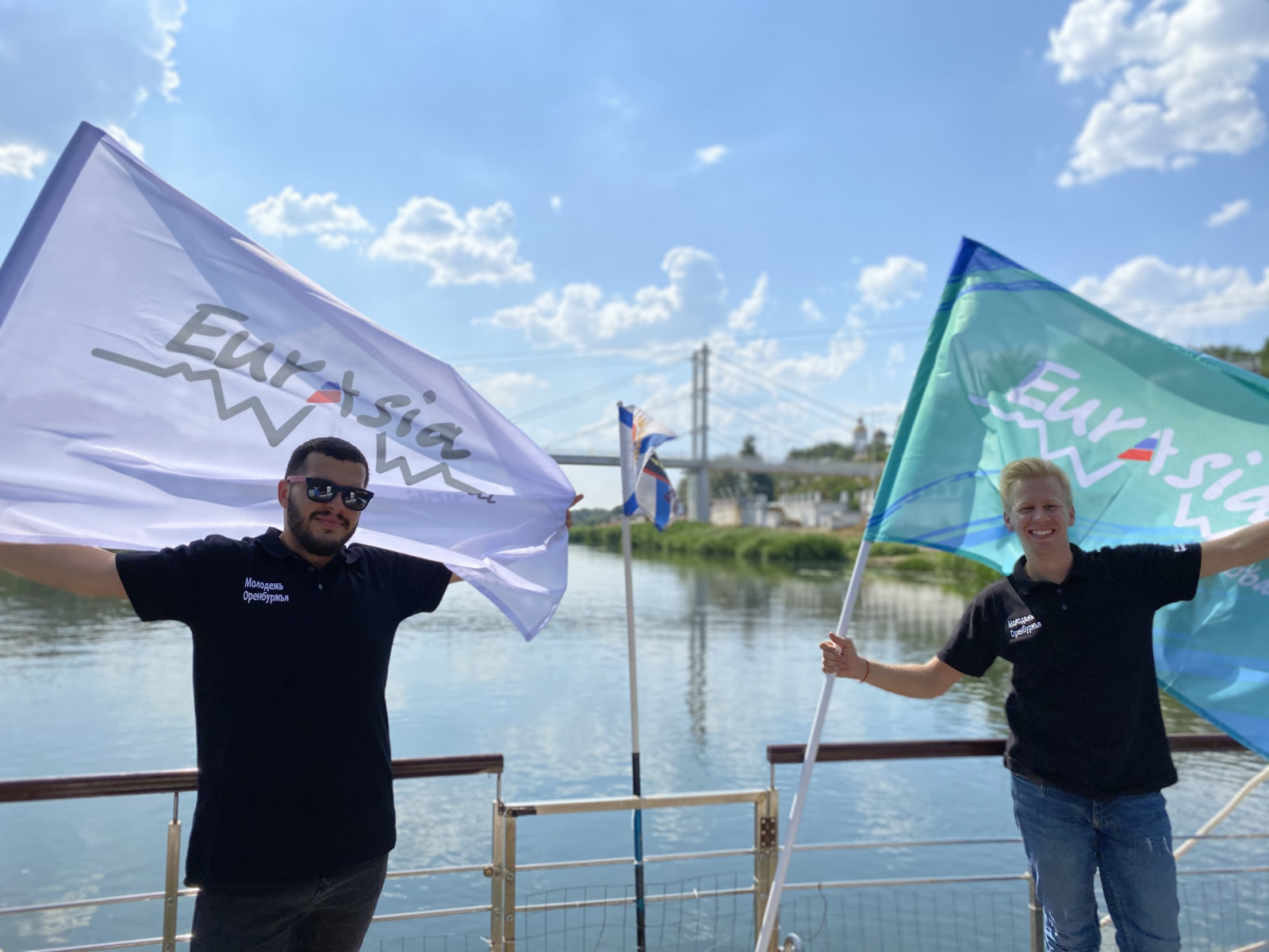 Атрибутом акции «Евразия в пути» стали флаги с символикой форума. Набережная реки Урала в Оренбурге выбрана не случайно – это одно из мест, которое ежегодно посещают участники форума.