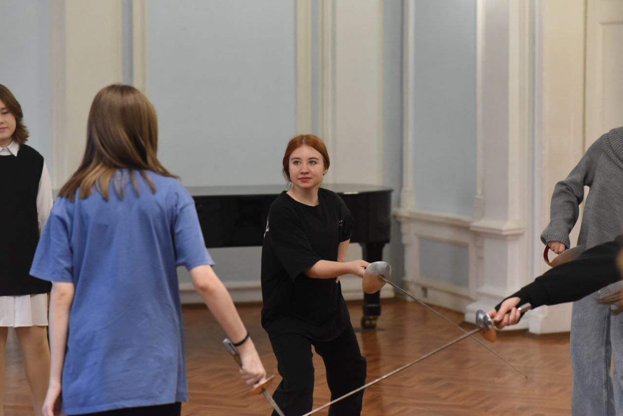 В голубом зале библиотеки девятиклассники учились правильно держать в руках шпаги, направлять удар и парировать его. Потом ребята направились учиться правильно говорить у актрисы мобильного исторического театра теней «Лица во времени» Ольги Колесниковой, рассказавшей им, как правильно дышать, сидеть, говорить.