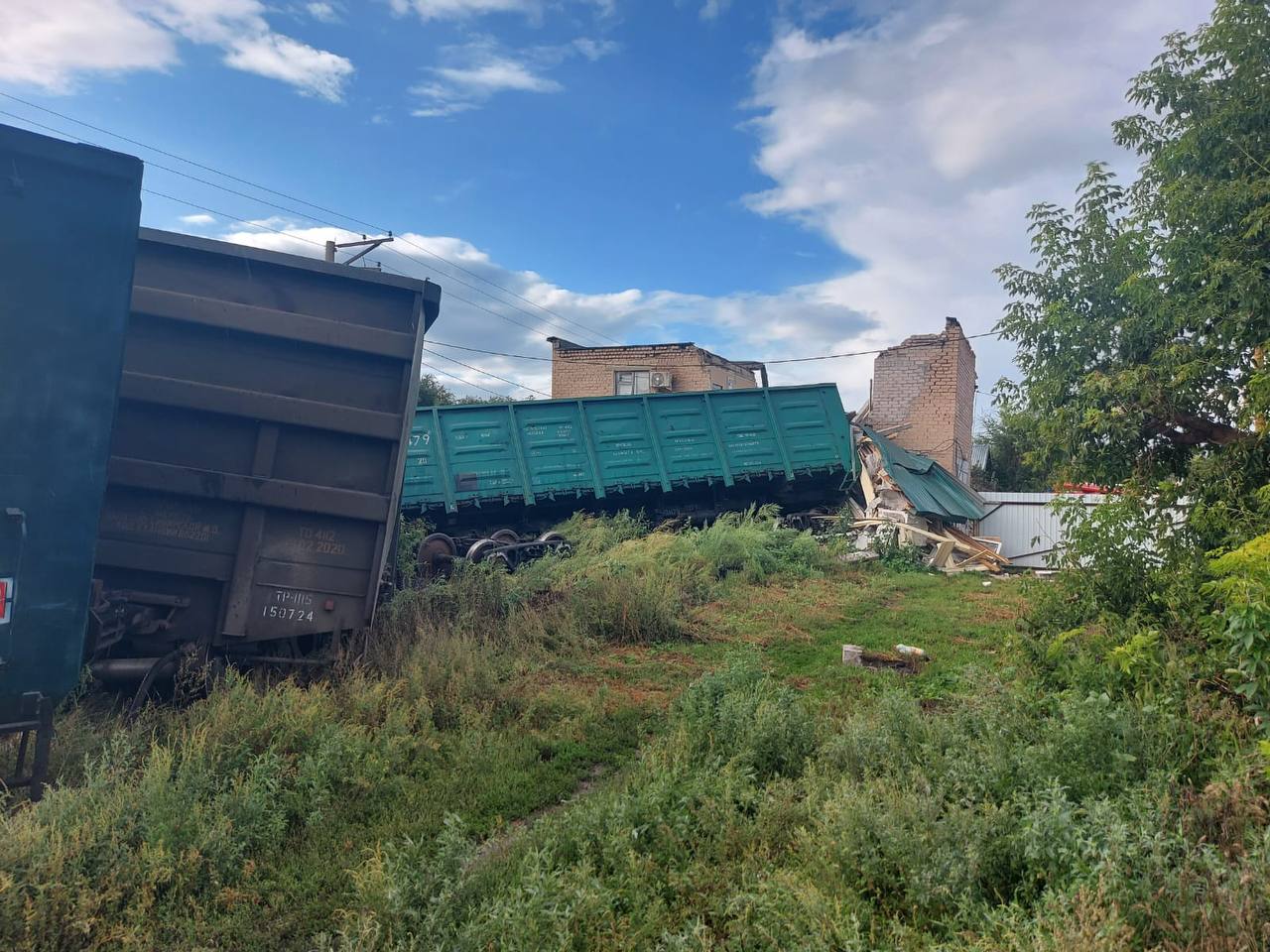 Двухэтажное здание станции оказалось частично разрушено, его зацепило грузовыми вагонами.