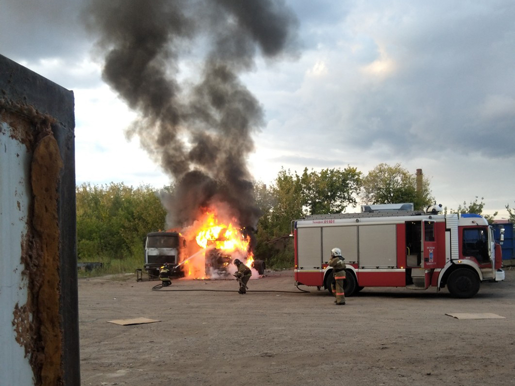 Первым загорелся большегруз «Мерседес». Припаркованный рядом МАЗ также пострадал. Огонь повредил лакокрасочное покрытие, пластиковые брызговики, обшивку салона и стёкла автомобилей.