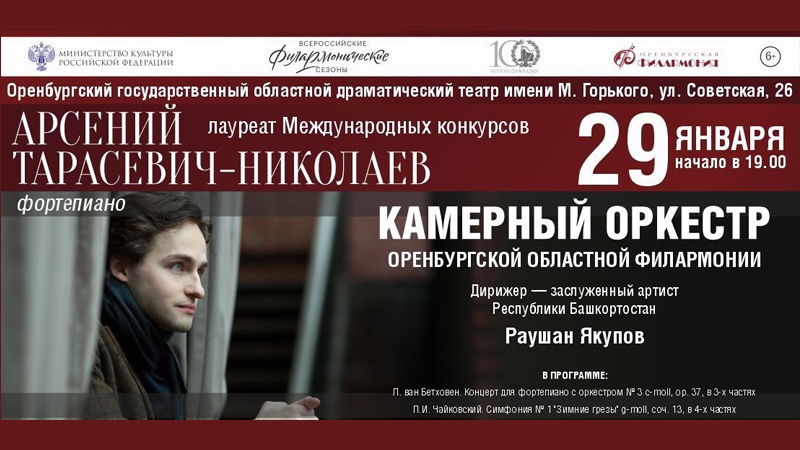 Совместно с Камерным оркестром Оренбургской филармонии под управлением заслуженного артиста Республики Башкортостан музыкант исполнит Концерт для фортепиано с оркестром №3 Бетховена, Симфонию №1 «Зимние грёзы» Чайковского.