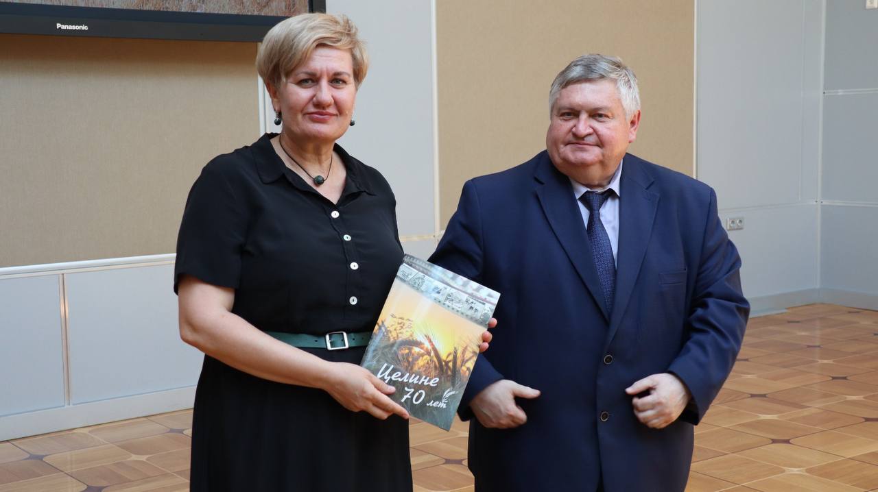 Сергей Балыкин передал часть тиража журнала «Целине – 70 лет» директору библиотеки Светлане Мячиной, для последующей передачи в библиотеки городов и районов области.