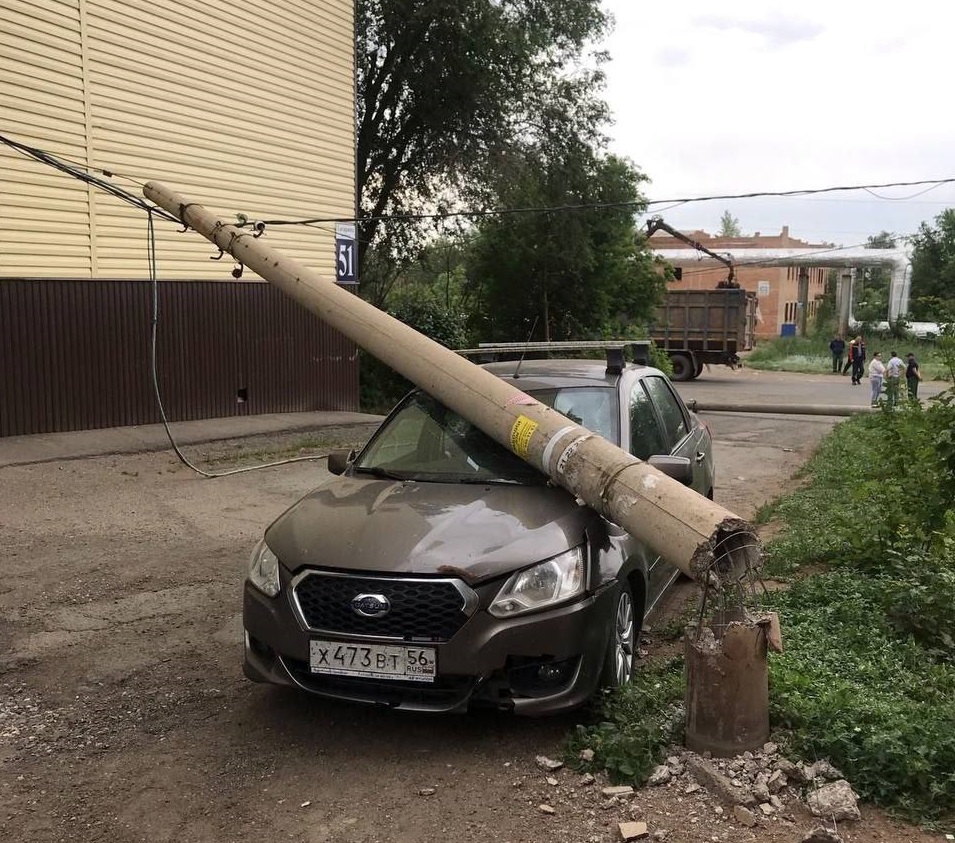 На проспекте Гагарина Оренбурга столб упал на припаркованный автомобиль.