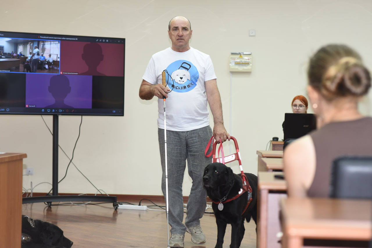 Во время конференции вышел на связь директор российской школы подготовки собак-проводников Всероссийского общества слепых Артём Астанин.