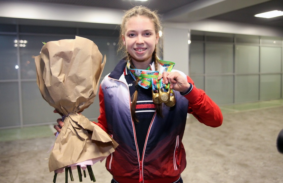 Оренбурженку Эльвиру Сатлыкову, с триумфом вернувшуюся из Нью-Дели с чемпионата мира по гиревому спорту, торжественно встретили в Оренбургском аэропорту.