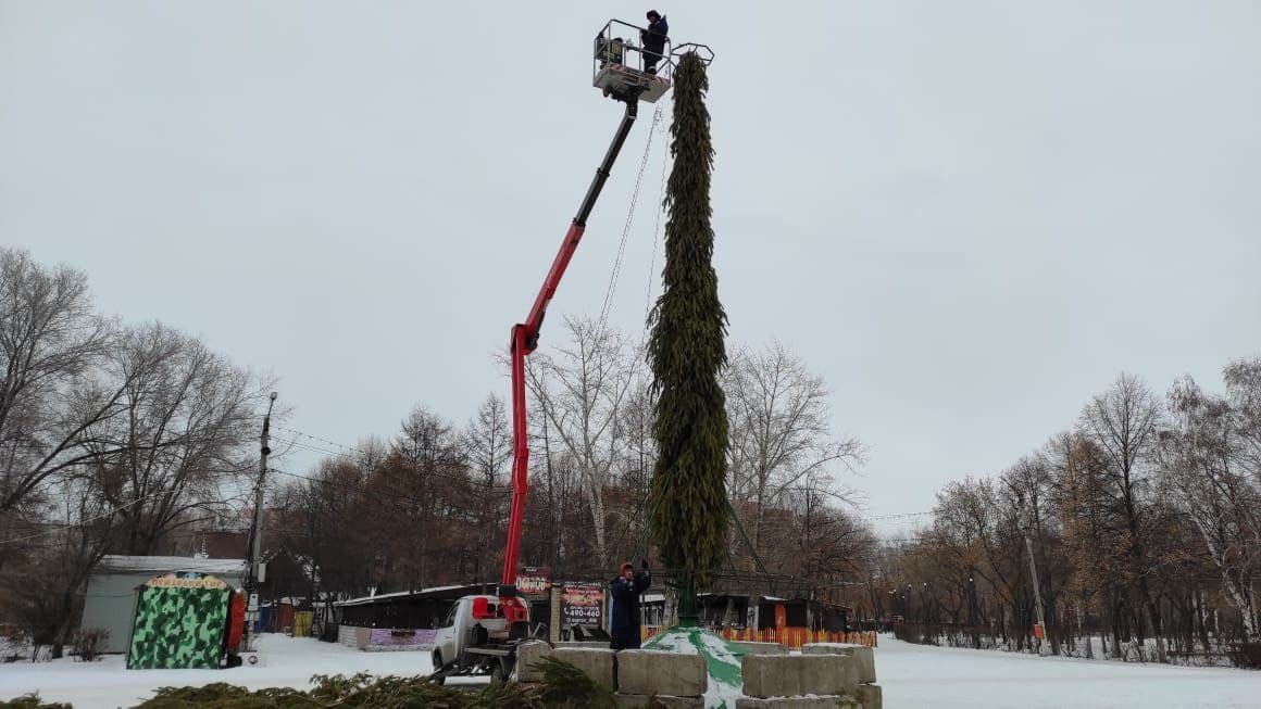 В парке имени 50-летия СССР на прошлой неделе установили каркас для 12-метровой ёлки. Сейчас специалисты муниципального коммунального предприятия «Комсервис» набивают его хвойными ветками.