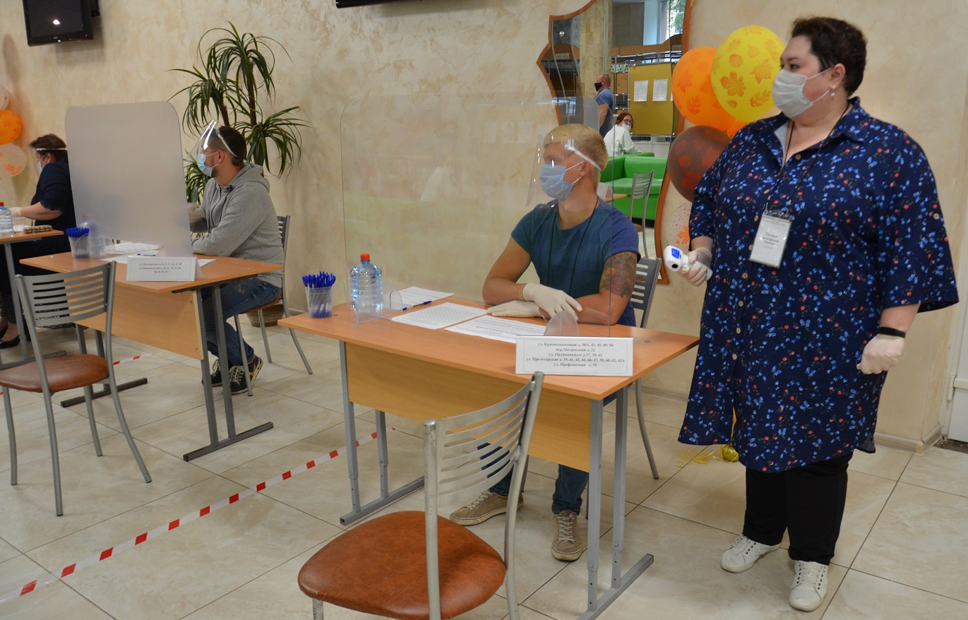 Социальная дистанция в помещении отмечена разметкой. На столах установлены защитные пластиковые экраны. Индивидуальные защитные предусмотрены для членов избирательной комиссии. Все контакты с избирателями – предъявление паспорта, вручение бюллетеня – осуществляются на безопасном расстоянии. Стационарная видеокамера на участке отрегулирована так, чтобы хорошо были видны все действия, и в поле зрения находился ящик для голосования.