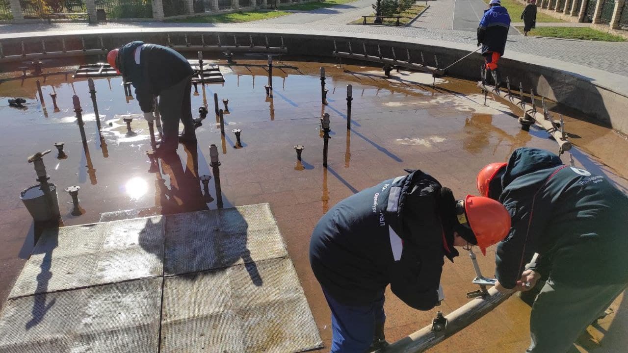Специалисты ООО «Оренбург Водоканал» сливают воду из трубопроводной системы, очищают чаши фонтанов, промывают их, после чего демонтируют насосное, электрическое и звуковое оборудование.
