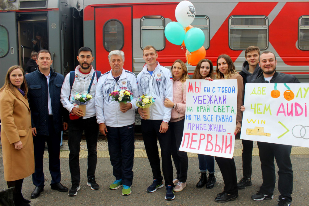 Под аплодисменты болельщиков и родственников на перрон вышли мастер спорта международного класса, многократный чемпион страны Дияс Избасаров и мастер спорта, многократный призер чемпионата России Илья Невмарин, а также их тренер Геннадий Викторович Чеботарёв.