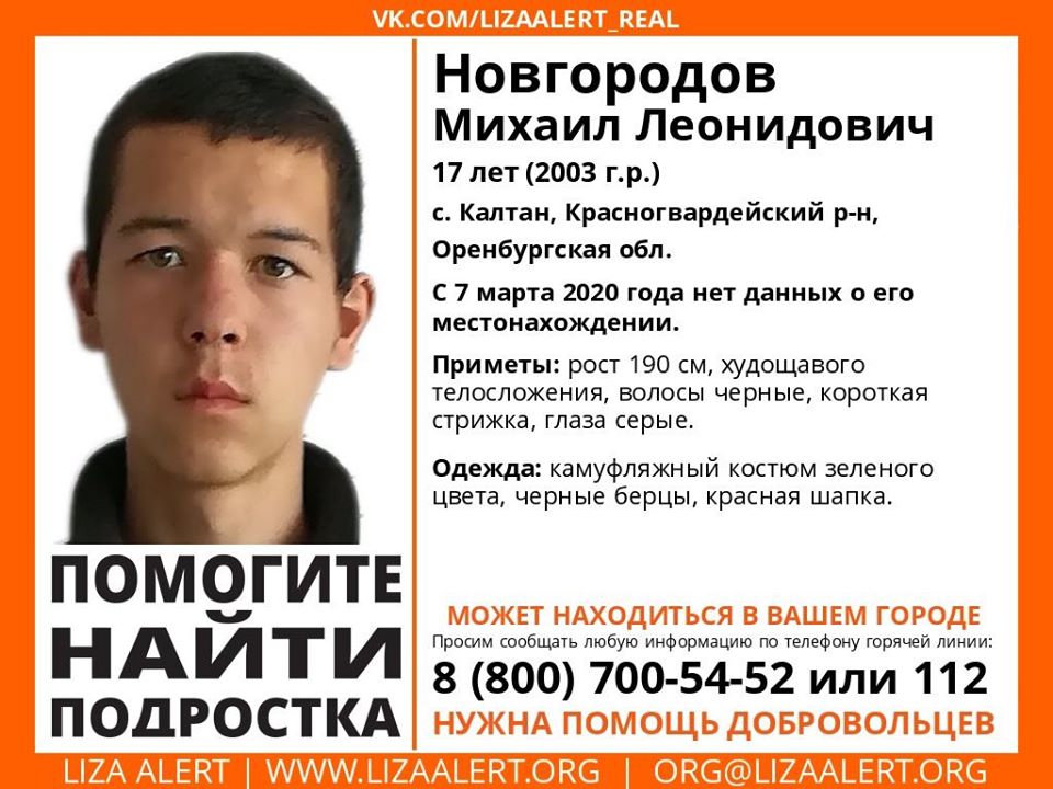 7 марта этого года Михаил Новгородов выехал из посёлка Токское Красногвардейского района в Бузулук, где находился до 11 марта. 11 марта около 9 часов Михаил Новгородов ушёл из квартиры, расположенной по адресу: Бузулук, улица Серго, дом № 21, квартиры 6, и до настоящего времени его местонахождение не известно.