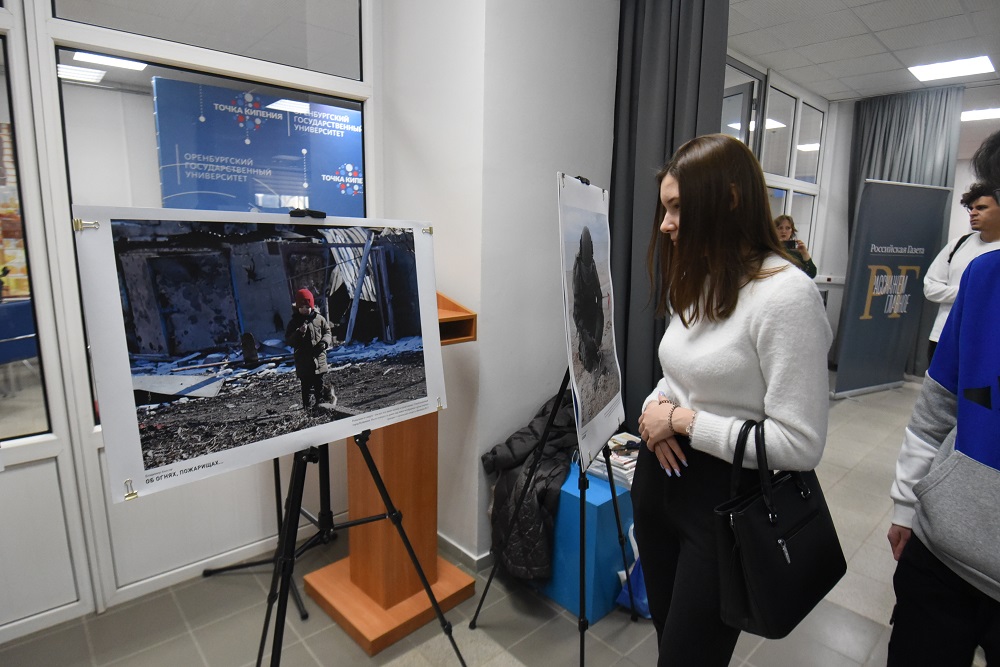 Сегодня в «Точке кипения» Оренбургского государственного университета директор Самарского филиала «Российской газеты» Арсений Бабенков представил авторскую фронтовую выставку военного корреспондента Владимира Аносова «Донбасс-2022».