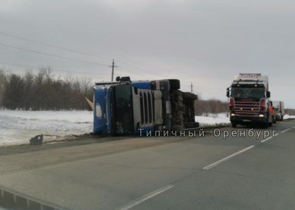 В районе села Каменноозёрного на бок опрокинулась фура. Фотографии с места происшествия появились в соцсетях.