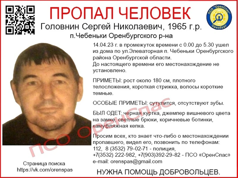 Всех, кто располагает информацией о местонахождении пропавшего, просят сообщить по телефонам: 112, (3532) 79-02-71 — полиция, (3532) 22-29-82, 8 903 392 29 82 — ПСО «ОренСпас». E-mail: orenspas@gmail.com.
