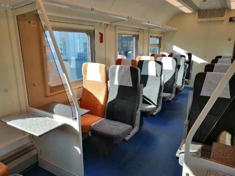 Новый вагон соответствует всем современным требованиям безопасности и комфорта. Он оснащен кондиционерами, системами обеззараживания воздуха, экологически чистым туалетным комплексом. В салоне имеется информационное табло, установлены удобные кресла с персональными аудиомодулями и розетками для зарядки мобильных устройств.