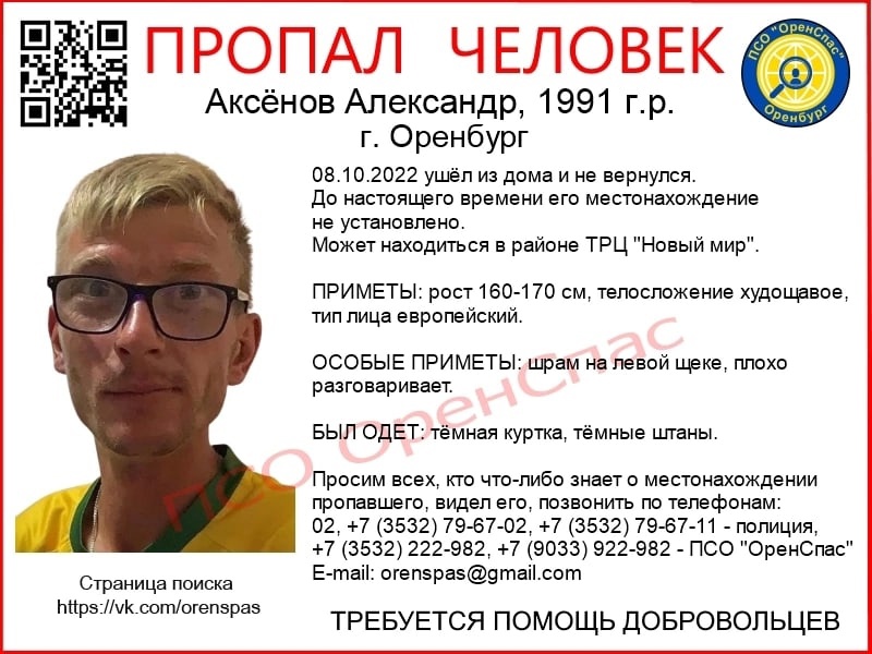 В октябре 2022 года житель Оренбурга пропал без вести. До сих пор Александра Аксёнова не нашли.