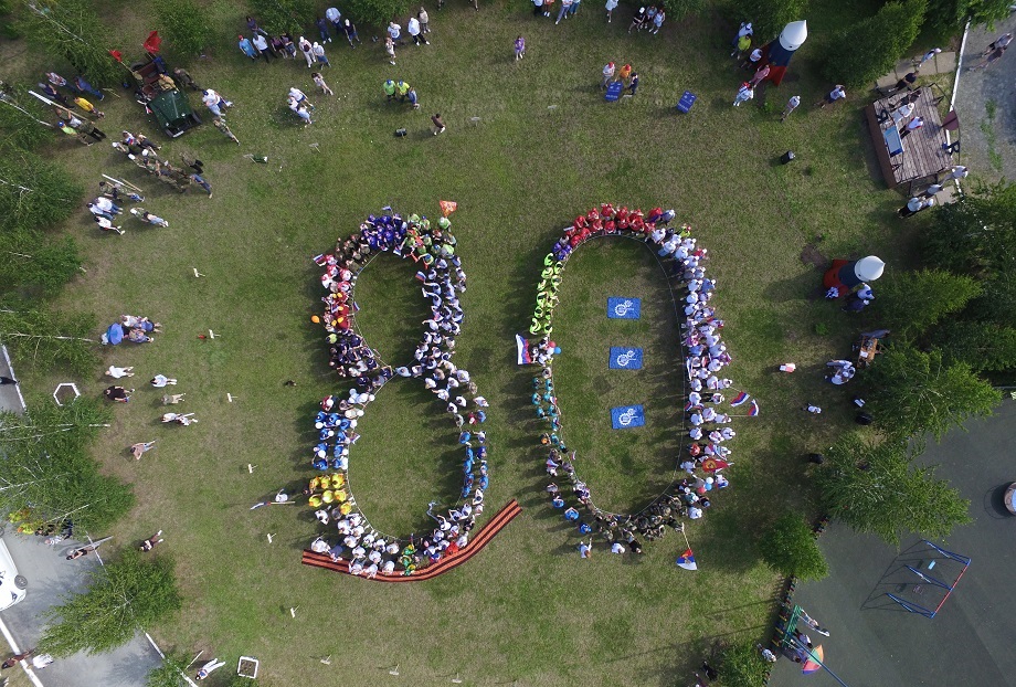 Поднятие флага ознаменовало открытие 18-го по счету фестиваля. Но перед тем, как приступить к выполнению конкурсной программы, молодежь «Стрелы» организовала флешмоб. Сотрудники объединения выстроились на центральной поляне турбазы, образовав «живую» цифру 80, отдавая тем самым дань уважения героям Великой Отечественной войны и юбилею Победы.