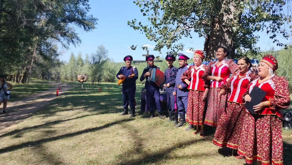 На берегу Урала расположились пирамидки с мишенями для упражнений с казачьей пикой, подставки для рубки лозы шашкой, площадки для стрельбы. Рядом навесы со столами и походная кухня. На видном месте посередине поклонный крест с иконой, прикрепленной к стволу большого дерева, рядом знамя общины Уральских (Яицких) казаков. Плакаты с фотографиями казаков прошлого и позапрошлого века.