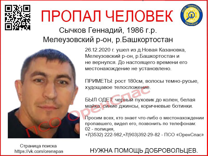 В Башкортостане несколько месяцев разыскивают жителя Мелеузовского района Геннадия Сычкова 1986 года рождения, сообщает ПСО «ОренСпас».