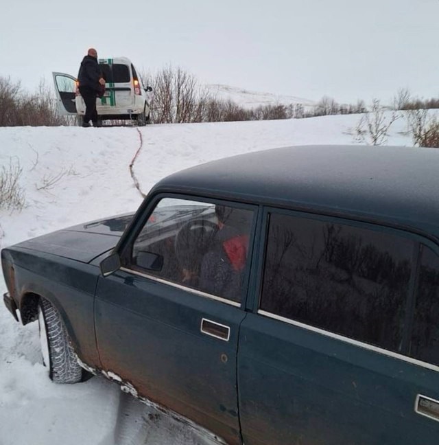 Сотрудники остановились и поспешили на помощь. С помощью троса они вытащили автомобиль на дорогу. Убедились, что с водителем и пассажиркой всё в порядке.