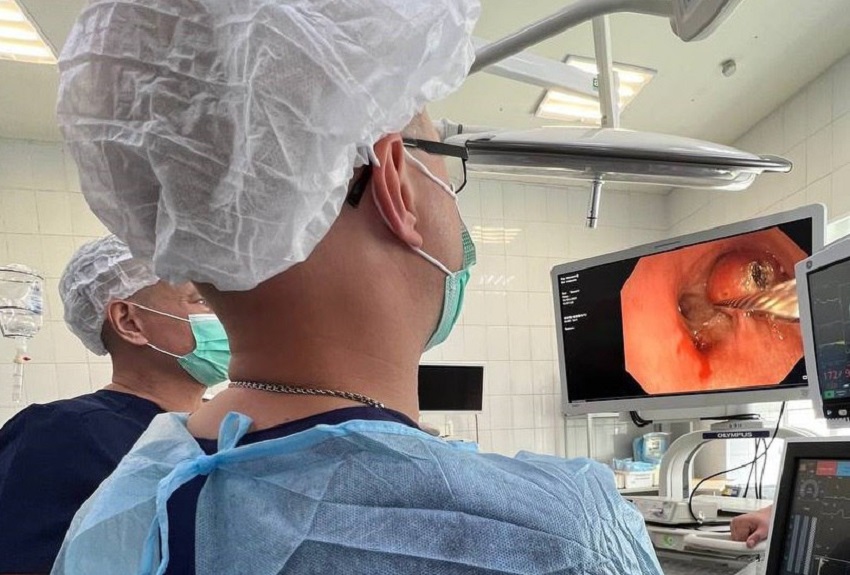 Пациент поступил в онкодиспансер в июле. Томография показала патологический очаг в легком. Образование располагалось глубоко в легочной ткани, поэтому использовать хирургические способы для взятия биопсии было опасно. Команда эндоскопистов выбрала малоинвазивный способ диагностики. С помощью эхобронхоскопа, на конце которого видеокамера и ультразвуковой датчик, специалисты изучили состояние бронхов изнутри, оценили патологические процессы и взяли материал для гистологического исследования.