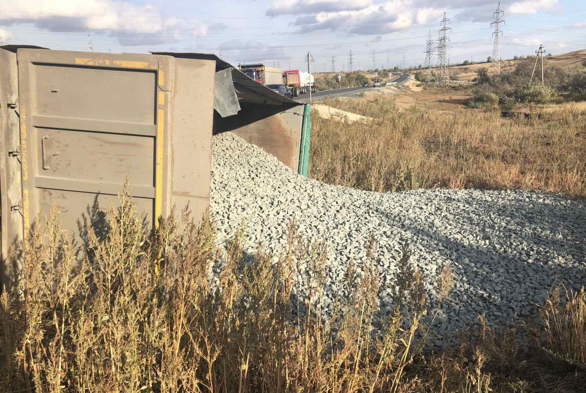 Грузовик, перевозивший щебень, от удара перевернулся и оказался в кювете. Локомотив и прицепленный к нему вагон сошли с рельсов.