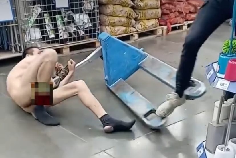 Голый мужчина сначала обхватил погрузчик и крутился с ним по полу. Сбежав от сотрудников магазина, орчанин вскарабкался на стеллаж.