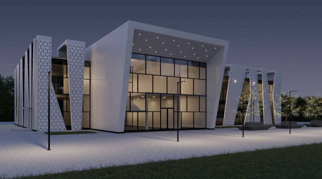 Фасад спорткомплекса, по планам, отделают панелями. Будут использованы конструкции из перфорированных листов, стеклянные декоративные панели и витражное остекление.
