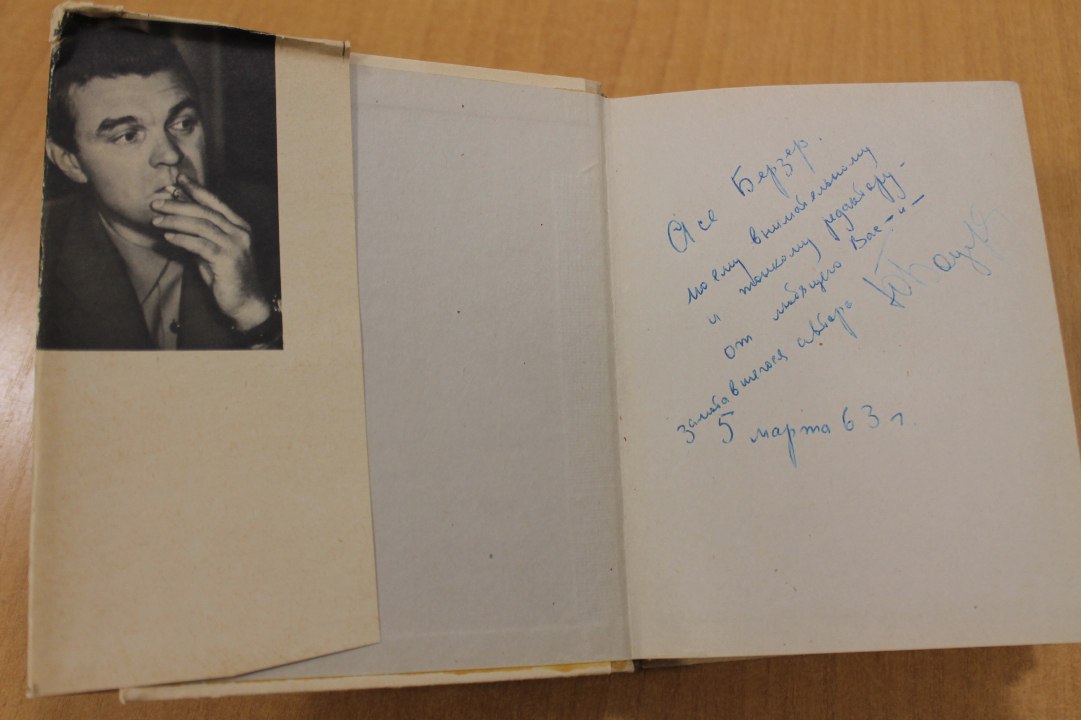 Издание романа Юрия Бондарева «Тишина», вышедшее в 1962 году и подписанное автором: «Асе Берзер – моему внимательному и тонкому редактору – от любящего Вас и зачитавшегося автора. Ю. Бондарев. 5 марта 1963 г.», стало первым подлинным экспонатом, поступившим в музей родного для писателя города.
