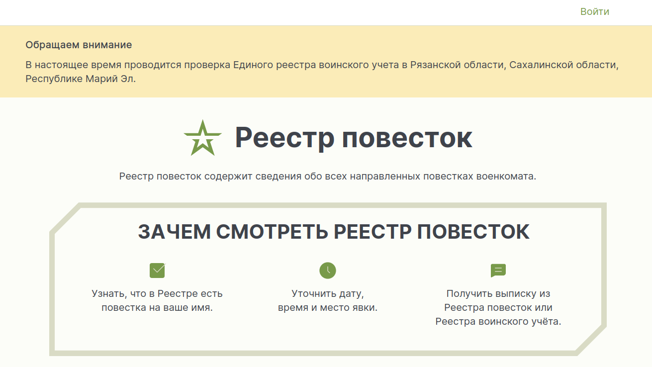 «В настоящее время проводится проверка Единого реестра воинского учета в Рязанской области, Сахалинской области, Республике Марий Эл», — говорится на сайте реестра.