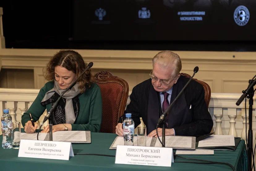 – Огромная честь быть сегодня здесь, разделять с вами радость этого события, быть свидетелем живых будней главного музея страны. И, что особенно отрадно – говорить о будущем. Собственно, документ, который мы сегодня подписали, это про будущее, про творческую работу, про более крепкие профессиональные связи, про возможный совместный проект, – сказала на церемонии Евгения Шевченко. – Не буду скрывать. Мы, конечно, мечтаем, что уже в скором времени будем открывать ещё один спутник Эрмитажа – в Оренбурге. И не просто мечтаем – мы энергично работаем над этим. И я сегодня постаралась познакомить Михаила Борисовича с актуальными этапами этого пути. Планируем уже осенью этого года приступить к ремонтно-реставрационным работам.