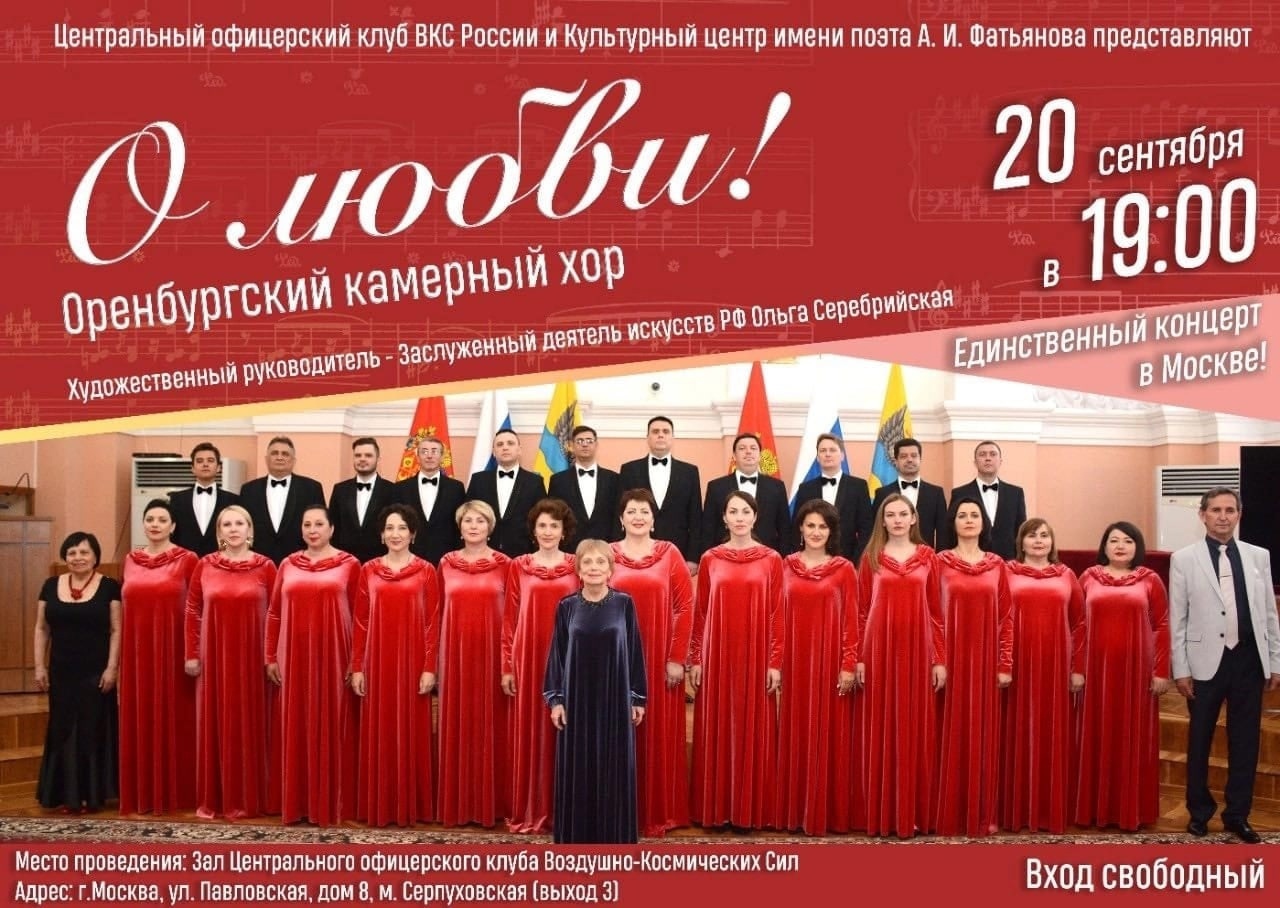 19 сентября Оренбургский камерный хор выступит в Боровске, а 20 сентября –в Москве на концерте «О любви!», который состоится в зале центрального офицерского клуба Воздушно-космических Сил России.