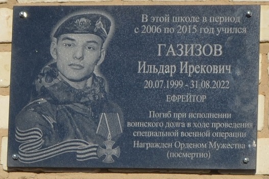 Разведчик-снайпер 21-й гвардейской отдельной мотострелковой бригады 2-й общевойсковой армии Центрального военного округа, ефрейтор Ильдар Газизов геройски погиб при отражении атаки противника на территории Донецкой Народной Республики. Посмертно награждён орденом Мужества.