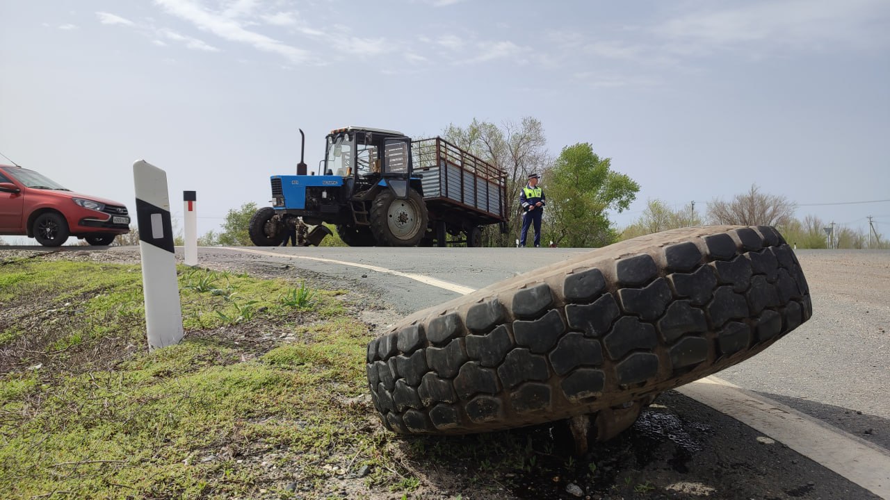На трассе в 5 километрах от Соль-Илецка водитель трактора не предоставил преимущество в движении водителю КамАЗа. Последний в результате столкновения выехал на полосу встречного движения, а его прицеп с зерном перевернулся в левый по ходу движения кювет.