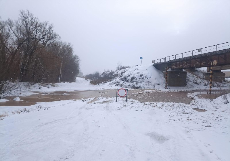 В результате частых перепадов температуры воздуха река Маньяшка разлилась и затопила дорогу под мостом. Вскоре ударил мороз, и тонкий лёд припорошило снегом.