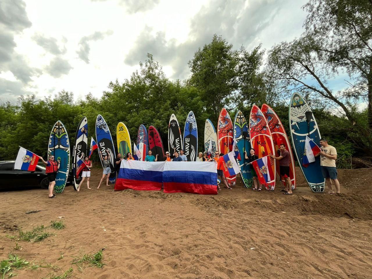Участие в акции приняли сотрудники администрации округа, активисты, работники культуры и образования. Они проплыли с флагами России от понтонного моста до моста на улице Плешановской.