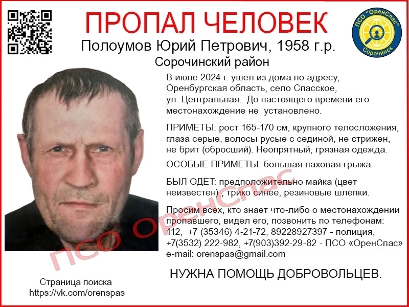 Полоумов Юрий Петрович, 1958 года рождения, в июне 2024 года ушёл из дома по адресу: село Спасское, улица Центральная.
